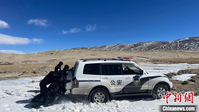 又經(jīng)歷一次陷車后,車輛實(shí)在無(wú)法前行。簡(jiǎn)單吃過(guò)自熱午餐后,民警一行帶好裝備開(kāi)始“步巡”,凜冽的寒風(fēng)似是帶著刀子般往骨頭里鉆,雪地反射的光讓人睜不開(kāi)眼,此時(shí)海拔已將近5000米,氣溫零下23攝氏度。