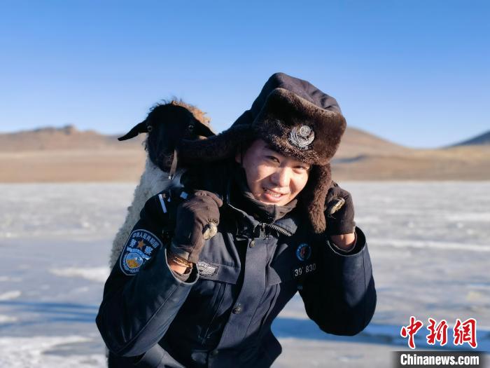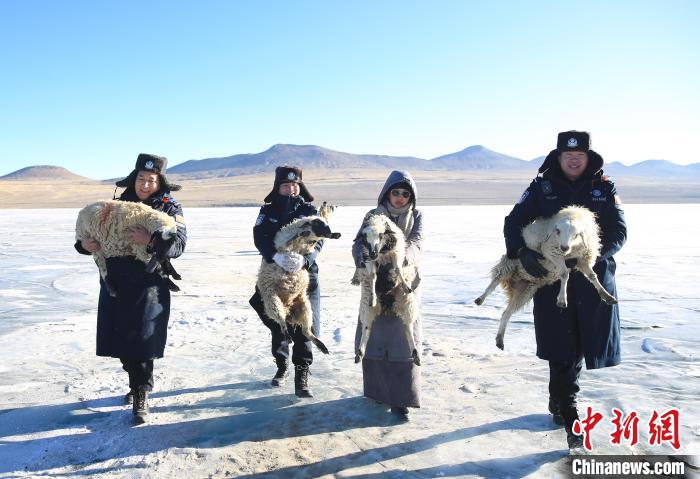 在光滑的冰面上,不時(shí)有小羊摔倒,甚至有“懶惰”的大羊直接“趴窩”不前,民警們不是將他們抱著就是扶著前行。在海拔5070米的冰面上負(fù)重前行,民警大口喘著粗氣,還時(shí)不時(shí)踩滑摔跤,但臉上始終洋溢著幸福的笑容。