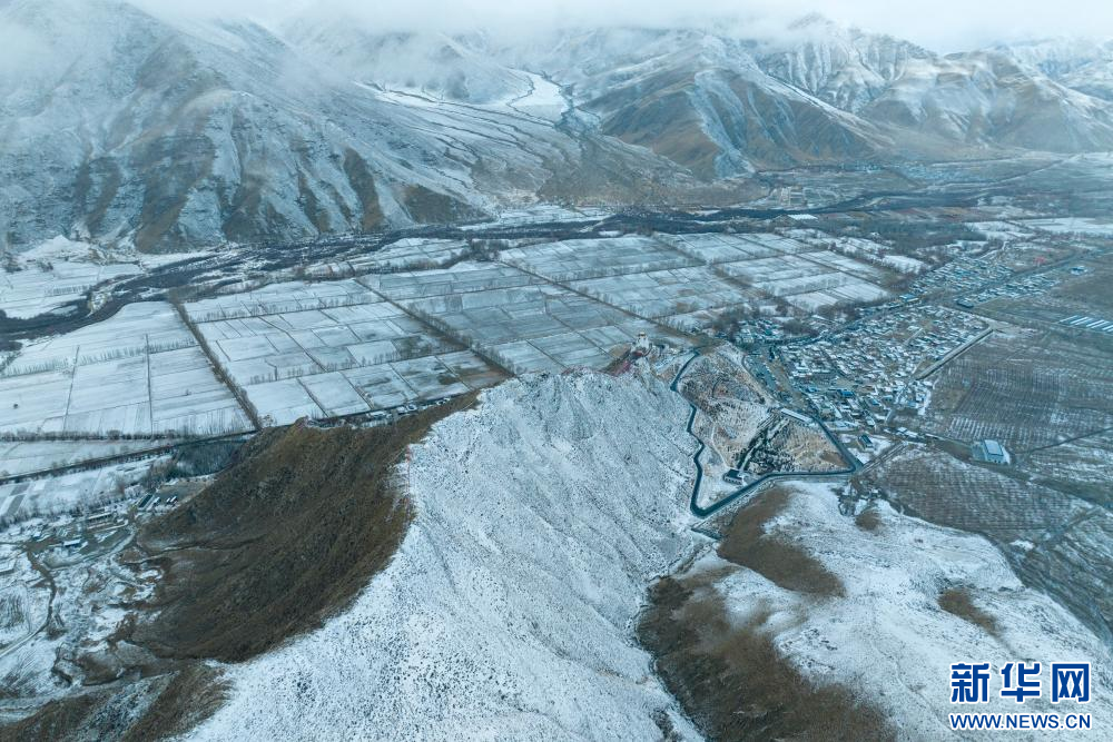 2月15日拍攝的雪后雍布拉康和山腳下的村莊(無人機(jī)照片)。新華網(wǎng) 旦增努布 攝