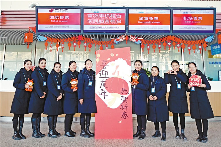 春運(yùn)期間,西藏民航人為廣大旅客架起歸途的平安天路,保障安全、順暢、高效出行。圖為貢嘎機(jī)場(chǎng)旅服部工作人員在航站樓現(xiàn)場(chǎng)為旅客送上新年祝福。
