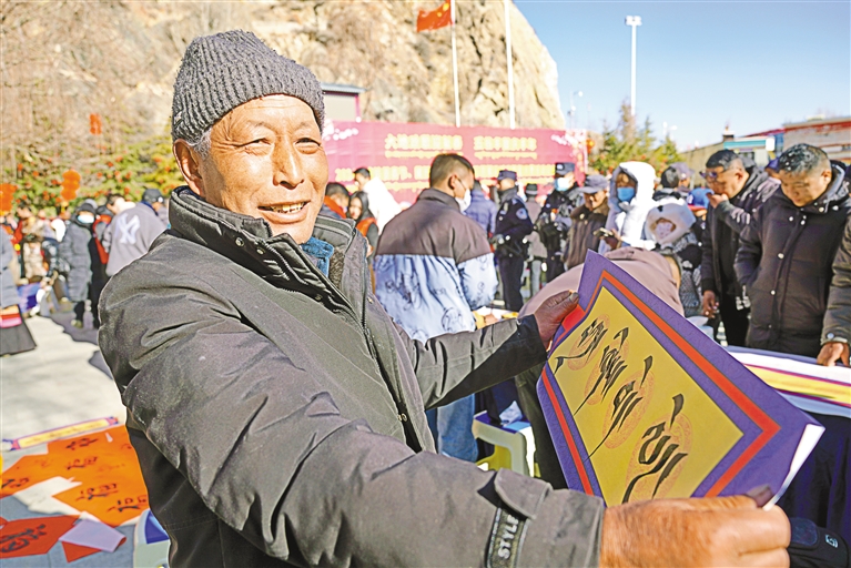山南市文聯(lián)組織書法家走進(jìn)瓊結(jié)縣,開展“我們的中國(guó)夢(mèng)——文化進(jìn)萬(wàn)家”活動(dòng)。圖為群眾展示獲贈(zèng)的藏文書法作品。