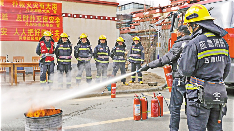 乃東區(qū)消防救援大隊(duì)來到乃東街道貢康社區(qū),組織駐村工作隊(duì)、網(wǎng)格員、群眾開展消防應(yīng)急演練,進(jìn)一步提升群眾火災(zāi)防范意識(shí)和應(yīng)急處置能力。圖為消防員正在指導(dǎo)群眾進(jìn)行滅火實(shí)操。