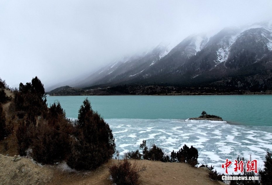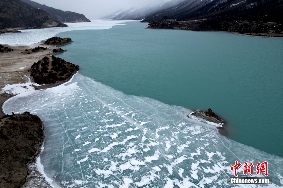 2月21日,西藏昌都市八宿縣,然烏湖半冰半水的湖面如畫一般,美不勝收。(無人機(jī)照片)中新社記者 李林 攝