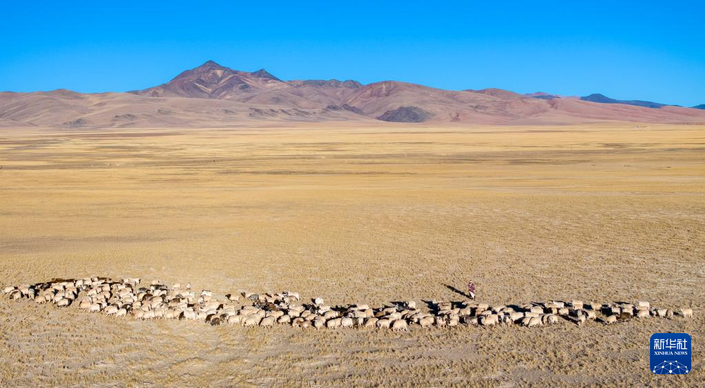 丹增在尼瑪縣俄久鄉(xiāng)馬遷村老家的草場(chǎng)上牧羊(無人機(jī)照片,2023年12月18日攝)。新華社 姜帆 攝