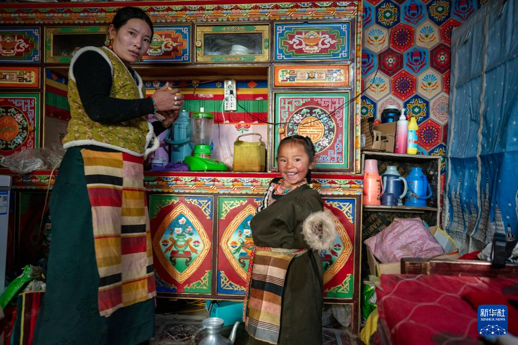 丹增的母親嘎宗(左)和4歲的小妹妹拉姆卓瑪在牧場(chǎng)上的老家打酥油茶(2023年12月18日攝)。新華社 姜帆 攝
