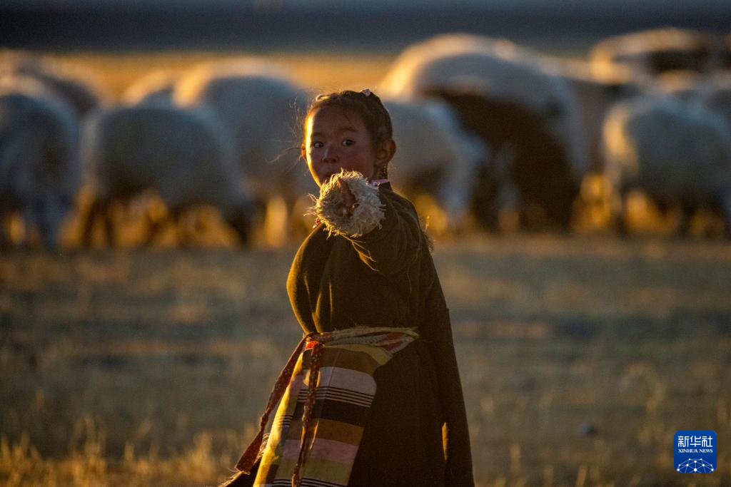 丹增在尼瑪縣俄久鄉(xiāng)馬遷村老家的草場(chǎng)上牧羊(2023年12月18日攝)。新華社 姜帆 攝