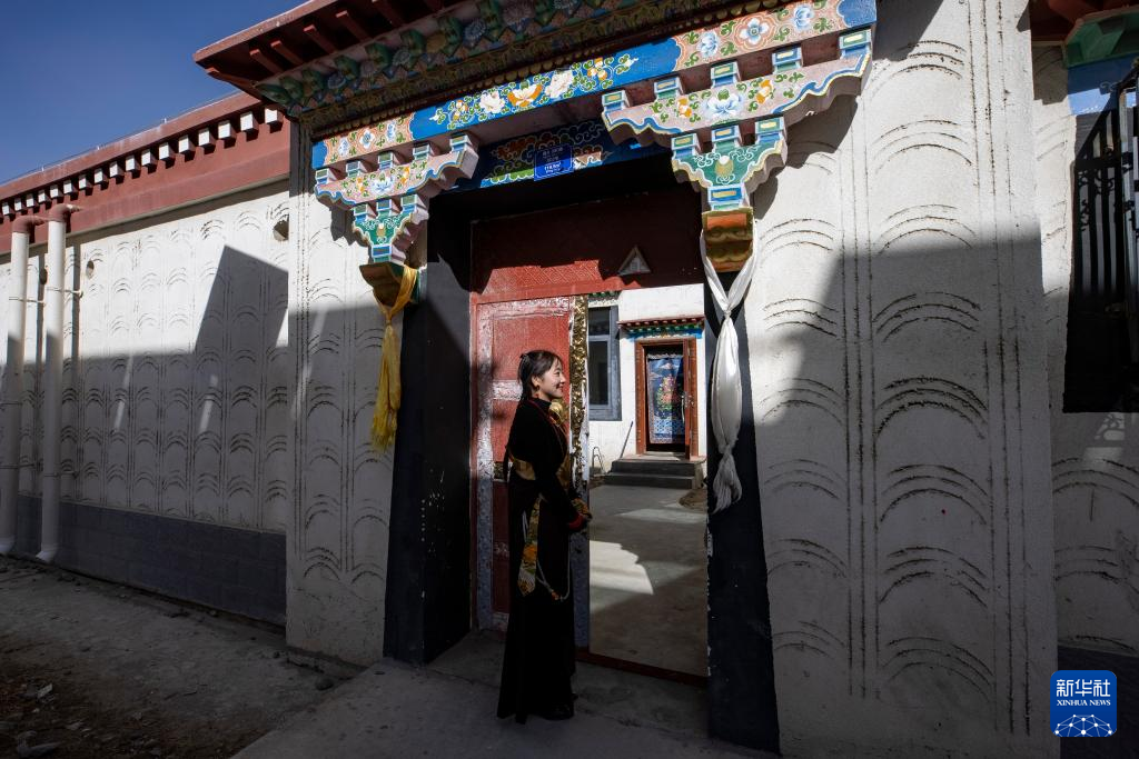 丹增在森布日生態(tài)搬遷安置點(diǎn)的新家門前(2024年1月24日攝)。新華社 姜帆 攝