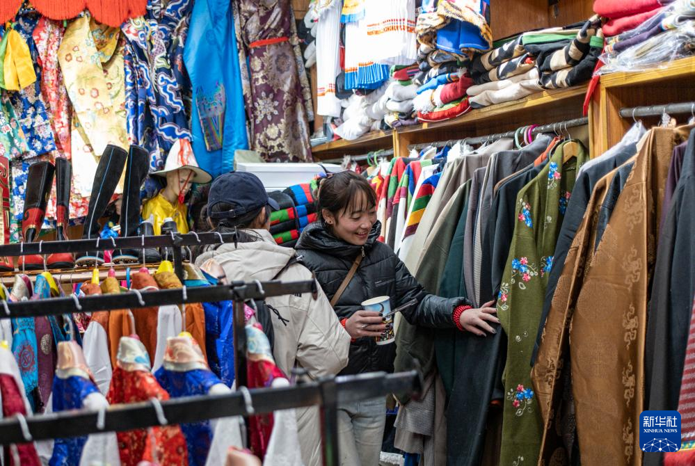 在拉薩市中心的一家商店,丹增(右)和小姐妹們正在挑選商品(2024年1月27日攝)。新華社 孫非 攝