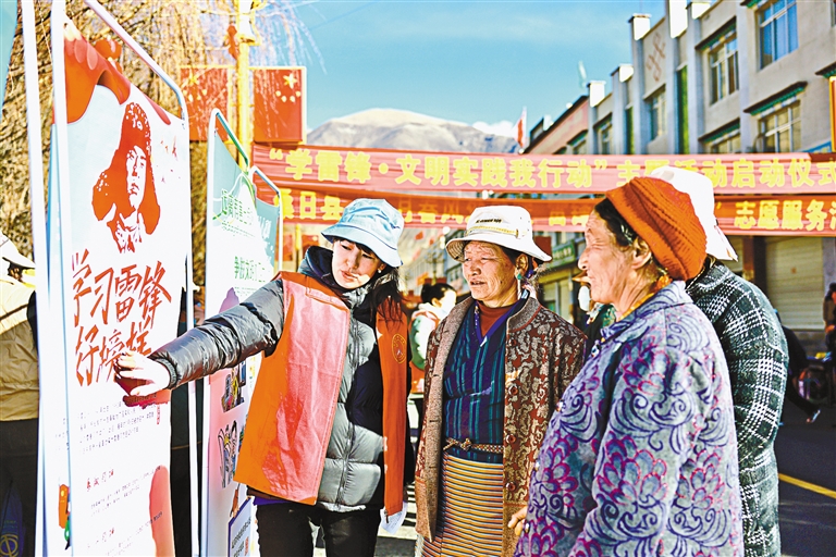 圖為在桑日縣“學(xué)雷鋒·文明實(shí)踐我行動(dòng)”主題活動(dòng)啟動(dòng)儀式現(xiàn)場(chǎng),志愿者向過(guò)往群眾講解雷鋒精神。記者 丹增平措 攝