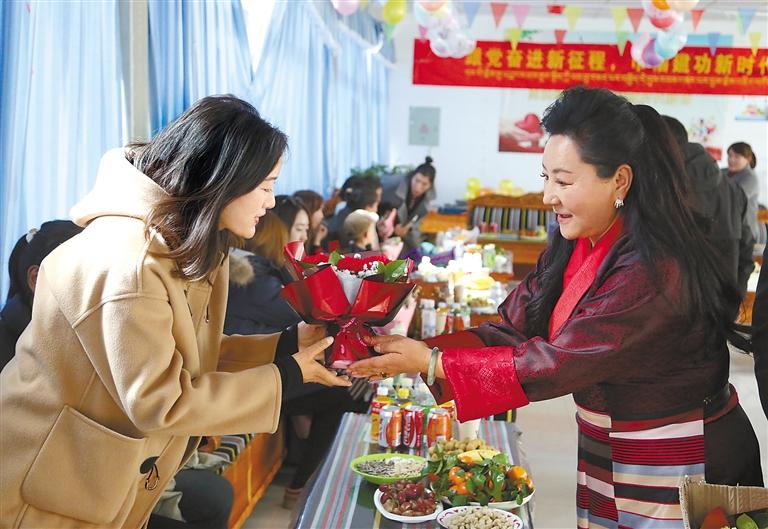 “三八”國際勞動婦女節(jié)來臨之際,山南市瓊結(jié)縣中心醫(yī)院組織醫(yī)院婦女職工一起慶祝節(jié)日。圖為瓊結(jié)縣中心醫(yī)院院長巴桑潘多(右)為醫(yī)院婦女職工獻上鮮花。 倫珠澤仁 洛桑 攝