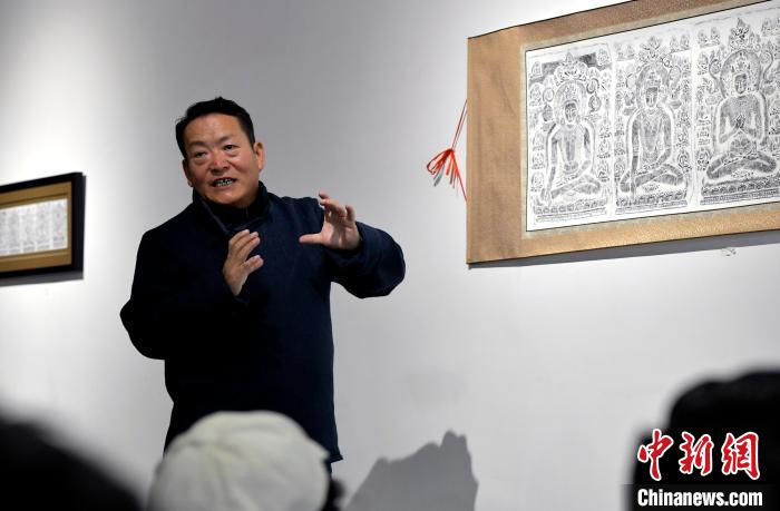 3月24日,格旺正在介紹石刻拓片。李林 攝