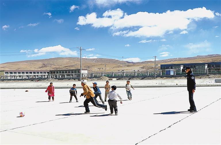 在結(jié)束執(zhí)勤,返回宿舍途中,里孜出入境邊防檢查站民警楊會強(qiáng)、盧帆忽聞一陣嬉笑。循聲看去,口岸邊貿(mào)市場停車場內(nèi),一群充滿活力的小朋友,正圍著一個破舊足球追趕。