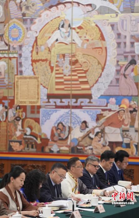2024年3月6日,出席十四屆全國人大二次會議的西藏代表團在北京人民大會堂西藏廳舉行開放團組會議,審議政府工作報告并回答記者提問。崔楠 攝