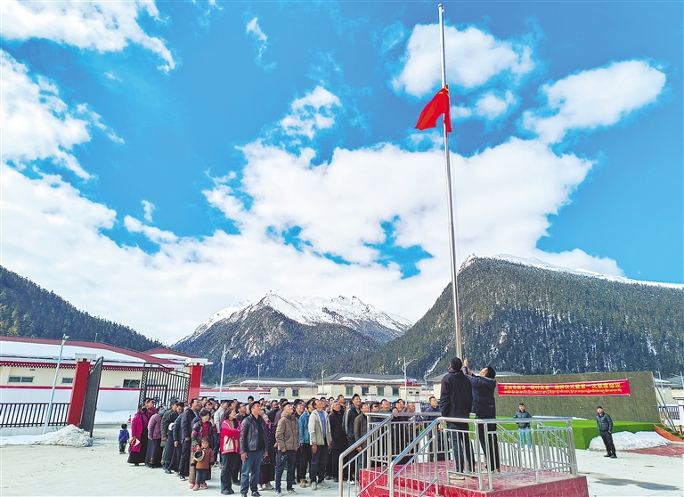 3月28日,米林市里龍鄉(xiāng)才巴村朗貢搬遷點(diǎn)的群眾舉行紀(jì)念西藏百萬(wàn)農(nóng)奴解放65周年升國(guó)旗儀式。周宇 記者 丹增群培 攝