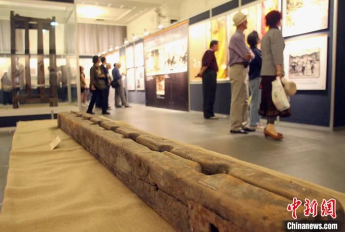 在北京民族文化宮舉辦的西藏今昔——大型主題展上,西藏歷史與封建農(nóng)奴制展區(qū)展出的舊西藏郎子轄監(jiān)獄的刑具——長方形木制四人腳銬。張勤 攝
