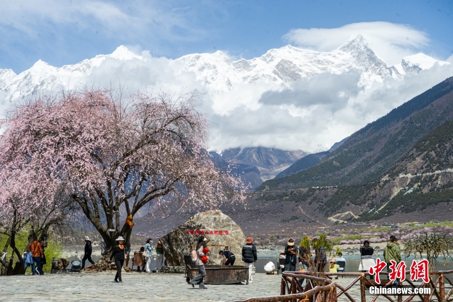 圖為游客在桃花樹下觀賞南迦巴瓦峰美景。中新社記者 貢嘎來松 攝