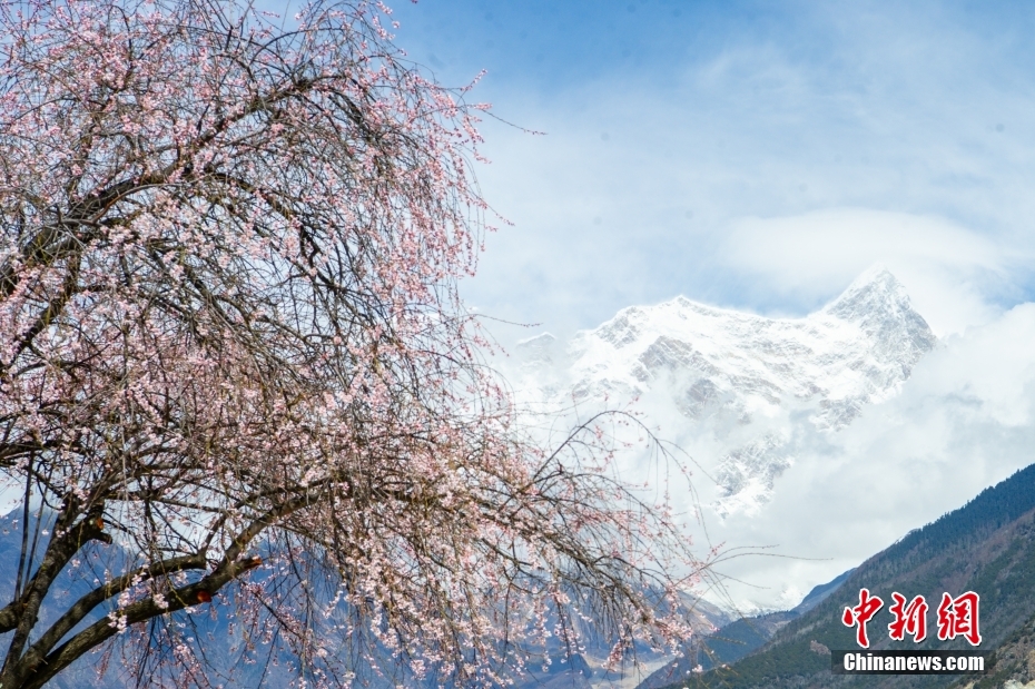 圖為桃花掩映下的南迦巴瓦峰。中新社記者 貢嘎來松 攝