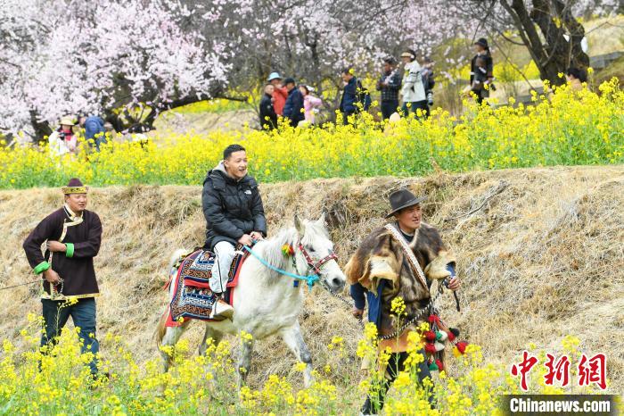 圖為在桃花園內(nèi),游客體驗騎馬。貢嘎來松 攝