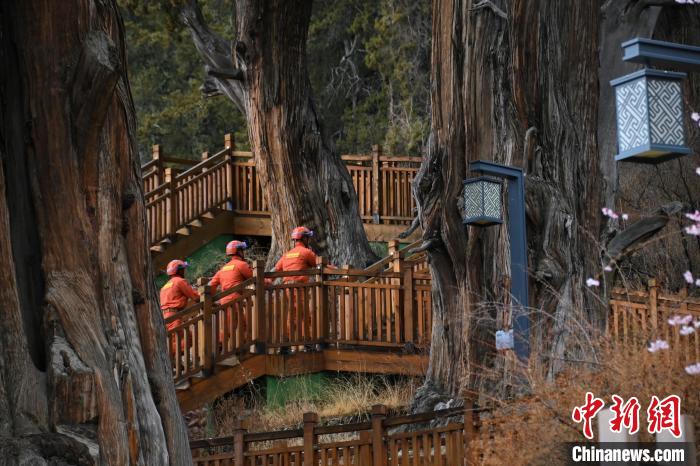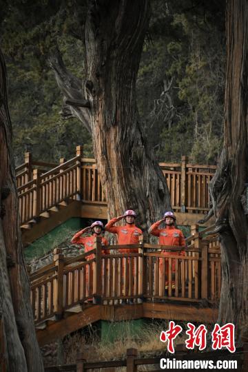 圖為消防員守護(hù)千年柏樹。西繞拉翁 攝
