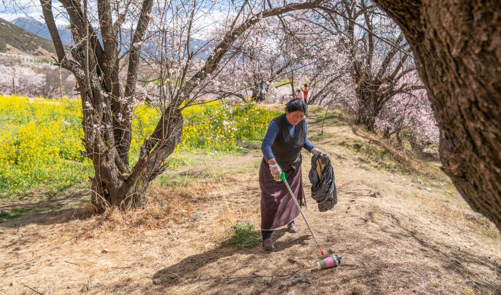 尼瑪曲吉在嘎拉村桃花園里撿拾垃圾。新華社記者丁增尼達(dá) 攝
