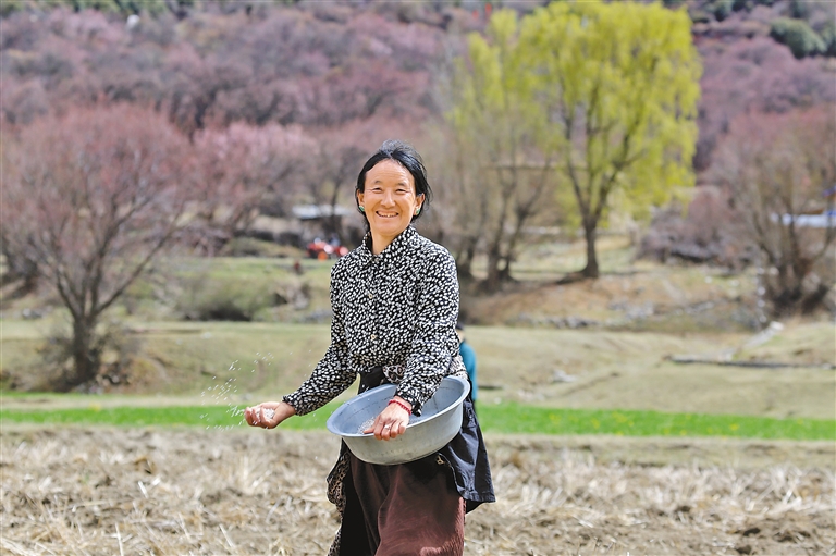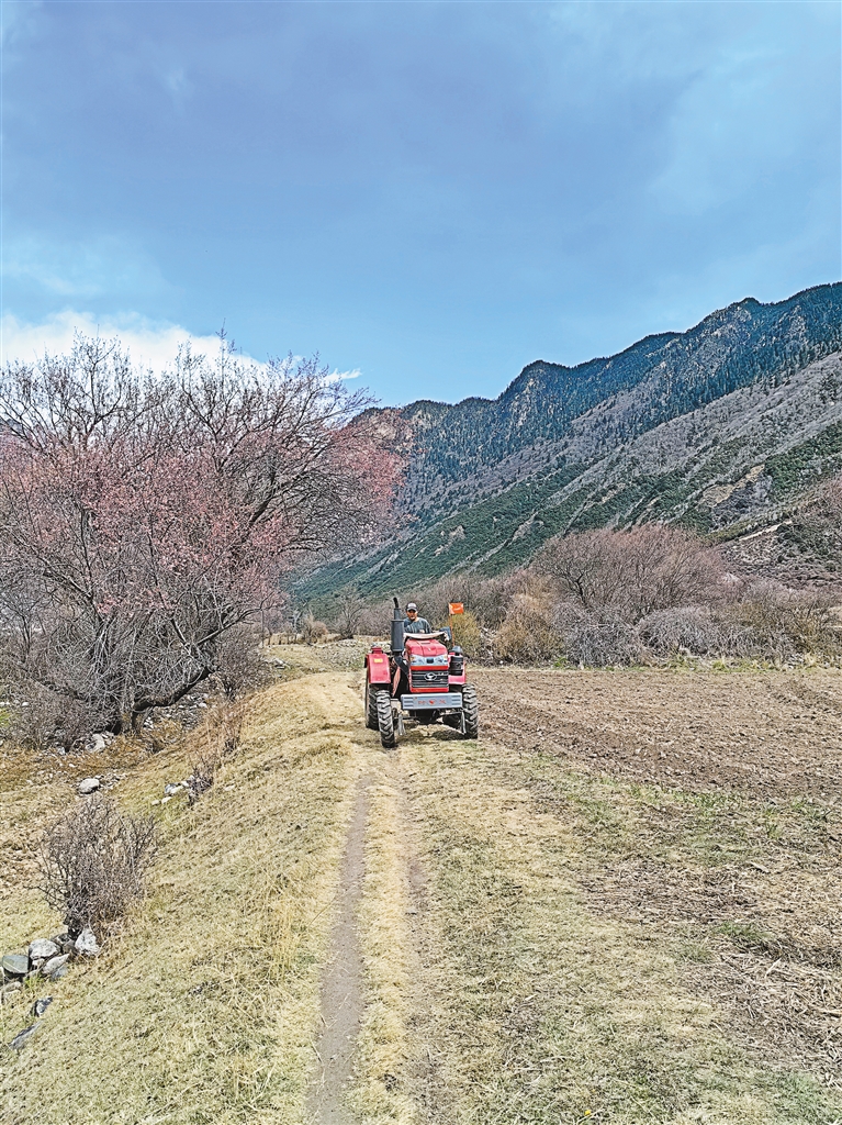 一輛紅色的旋耕機(jī)在田地旁停下來,曲美仁增邊換犁頭,邊感嘆著科技帶來的便捷:“以前耕地全靠牲畜,費時耗力,現(xiàn)在開著旋耕機(jī)就把地耕完了,聽著這機(jī)器轟隆隆的聲音,我覺得格外開心,好像在說我們尼屋的春天特別美,我們的生活肯定也會更幸福!”