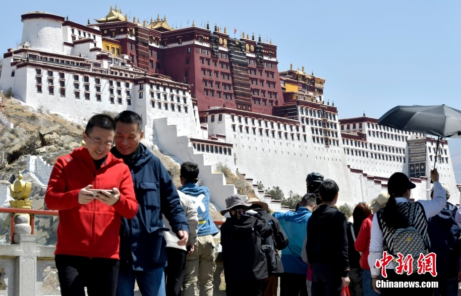 4月23日,游客在拉薩藥王山觀景臺拍照留念。隨著西藏旅游旺季臨近,中外游客來到雪域高原觀光旅游。中新社記者 李林 攝