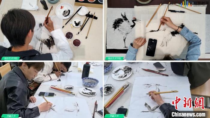 西藏大學藝術(shù)學院學生與南京藝術(shù)學院學生在線上共同繪制黑頸鶴。智慧樹平臺供圖
