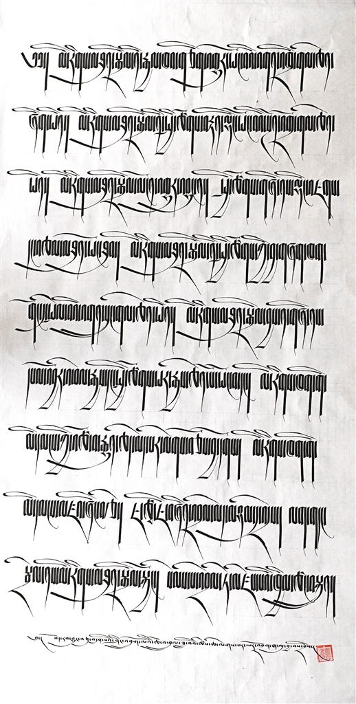藏文書法二等獎作品《維護國家統(tǒng)一、加強民族團結(jié)是各族人民的共同責(zé)任》?!∽髡摺“赚敿哟?/p>