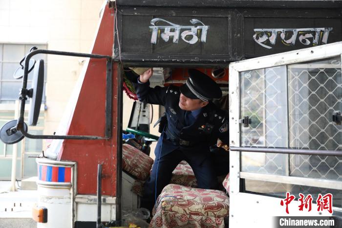 圖為“五一”假期,吉隆出入境邊防檢查站民警卜濤在吉隆口岸車輛驗放通道檢查出境車輛。肖富貴 攝