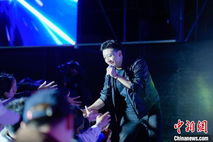 圖為歌手羅布桑珠跟觀眾互動。貢嘎來松 攝