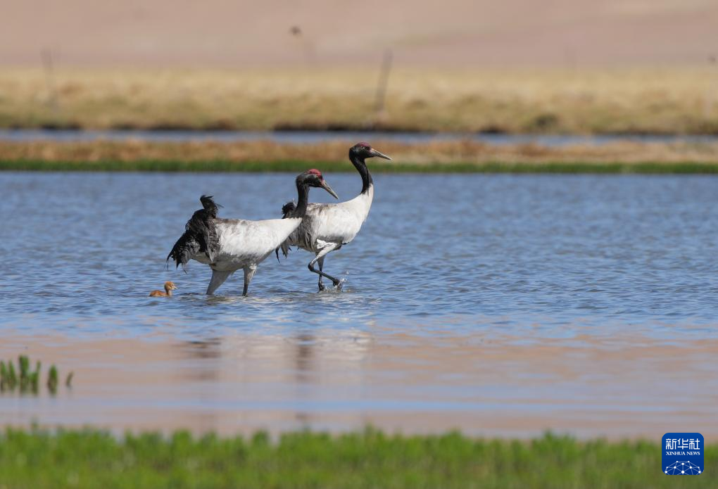 6月9日,一對黑頸鶴夫婦帶著雛鳥在西藏那曲市申扎縣一處濕地棲息、覓食。新華社記者 姜帆 攝