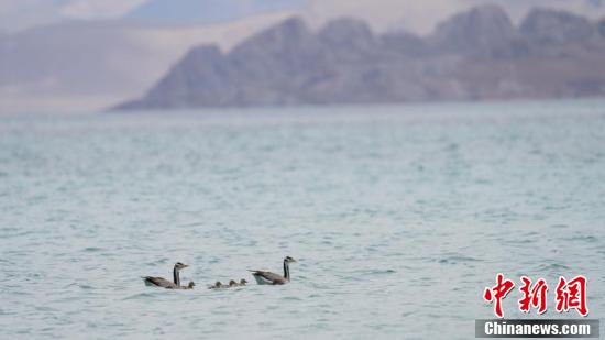 錯鄂湖鳥島斑頭雁一家。 貢確 攝
