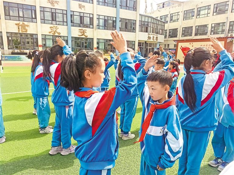 圖為新老少先隊員行禮。