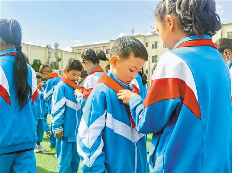 圖為少先隊員代表為新隊員佩戴紅領巾。記者 次仁平措 通訊員 胡舟 攝