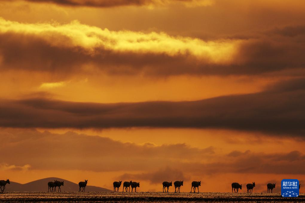 6月14日,在西藏那曲市尼瑪縣境內(nèi)的羌塘國家級自然保護區(qū)“無人區(qū)”深處,一群藏羚羊迎著朝陽,行進在遷徙路上。新華社記者 費茂華 攝