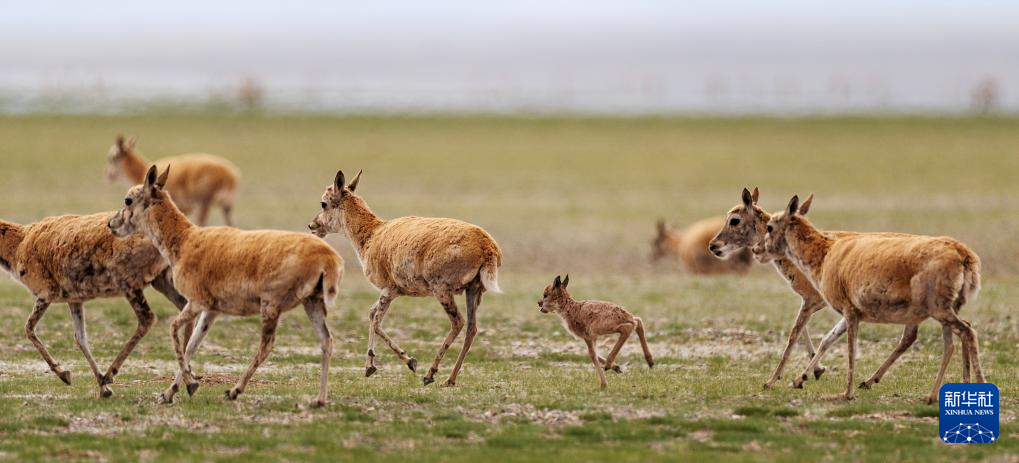 6月17日,在魯確塘草原上,一只剛出生不久的小藏羚羊跟著羊群奔跑。新華社記者 費茂華 攝??