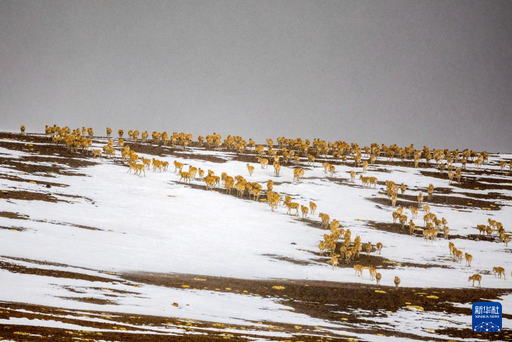大群遷徙的藏羚羊翻越覆蓋著積雪的山梁(5月10日攝)。新華社記者 姜帆 攝