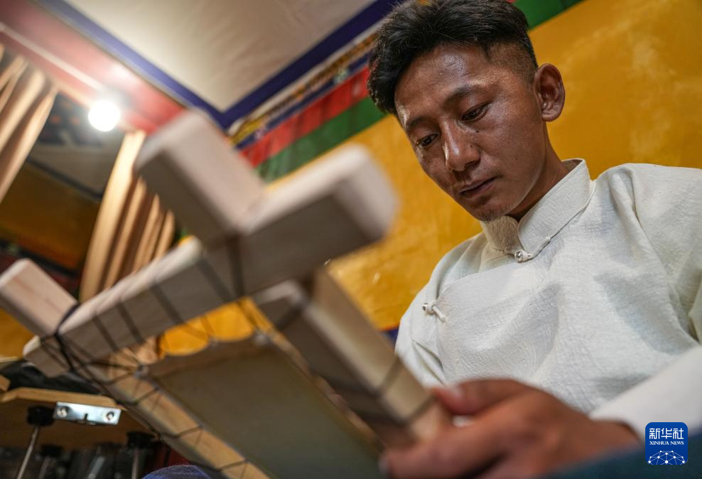 旦增特覺在店內繪畫(7月5日攝)。他曾是一名唐卡畫師。新華社記者 晉美多吉 攝