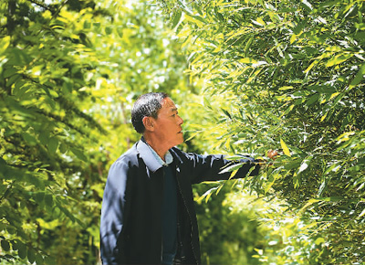 邊久在苗圃基地檢查樹(shù)苗生長(zhǎng)情況。