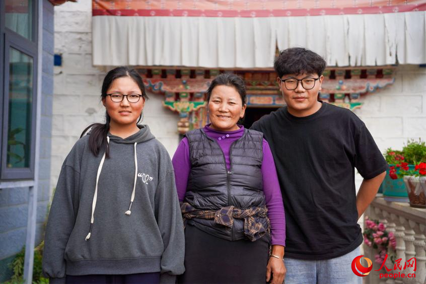 巴桑央宗、巴桑次仁和媽媽在自家院落。人民網記者 趙晨攝
