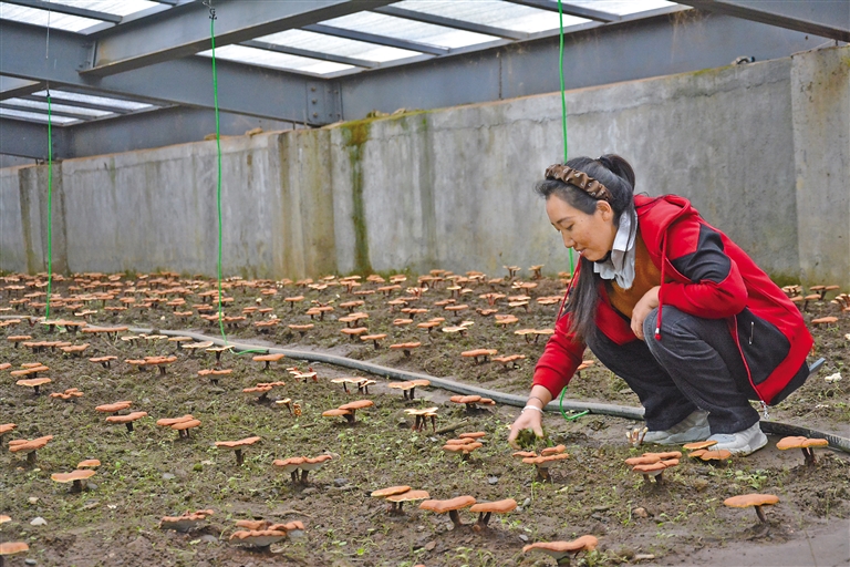 圖為珞瓦新村村民在大棚里檢查靈芝的長(zhǎng)勢(shì)。記者 汪純 丹增平措 武沛濤 攝
