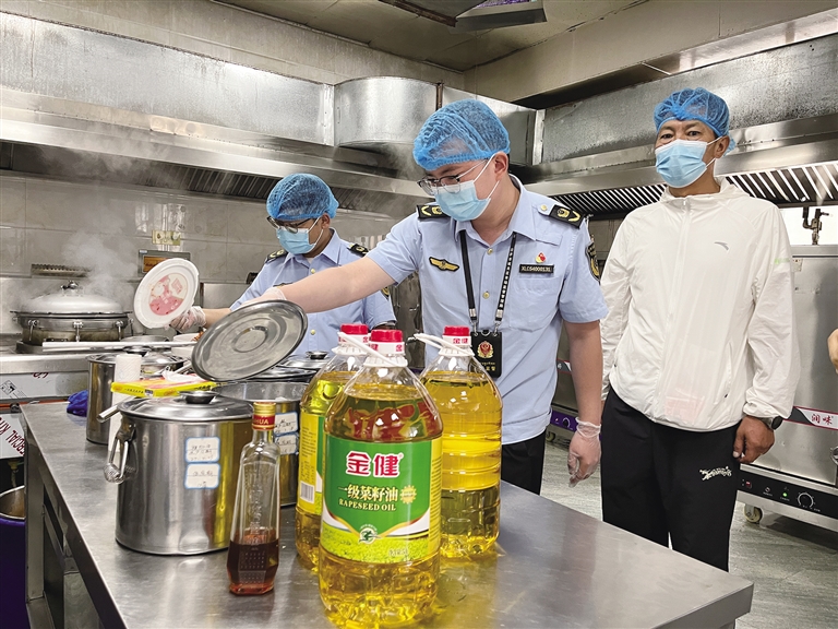 市場(chǎng)監(jiān)管部門工作人員開展校園食品安全檢查。