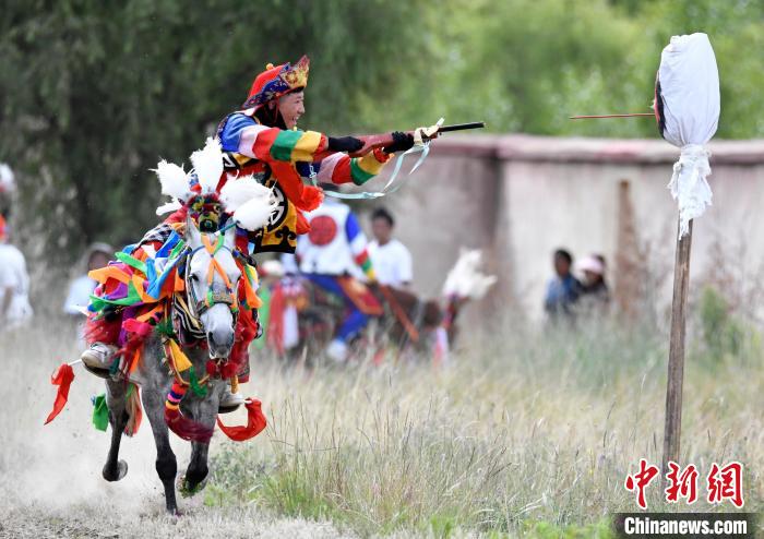 7月27日,西藏拉薩市桑達村迎來“望果節(jié)”,村民們舉行賽馬活動慶祝?!巴?jié)”是西藏傳統(tǒng)的豐收節(jié),具體日期隨各地莊稼成熟的時間而變化?!巴?jié)”期間,按照習俗,各地都會舉辦賽馬比賽。圖為騎手進行馬上射擊表演。中新社記者 李林 攝