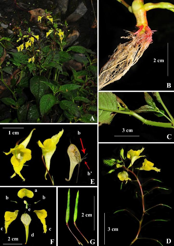 2022年,胡光萬研究員團隊在西藏隆子縣進(jìn)行野外科考時發(fā)現(xiàn)一種獨特的鳳仙花,后經(jīng)形態(tài)比對和分子系統(tǒng)學(xué)分析,確定其為新物種,并將其命名為隆子鳳仙花。隆子鳳仙花與輻射鳳仙花在形態(tài)上最為接近,但隆子鳳仙花的莖、葉、葉柄和花梗上均被柔毛覆蓋,輻射鳳仙花全株無柔毛,兩者區(qū)別明顯。