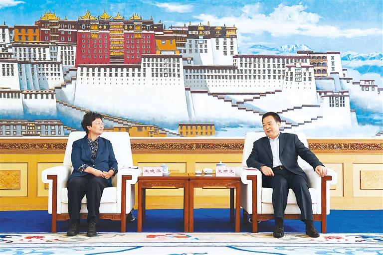 8日,自治區(qū)黨委書記王君正在拉薩與人力資源和社會(huì)保障部黨組書記、部長(zhǎng)王曉萍一行座談。