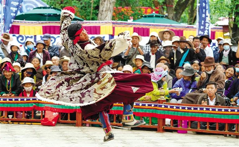 左圖:8月8日,山南市洛扎縣曲措藏戲隊在羅布林卡表演傳統(tǒng)藏戲《卓瓦桑姆》。