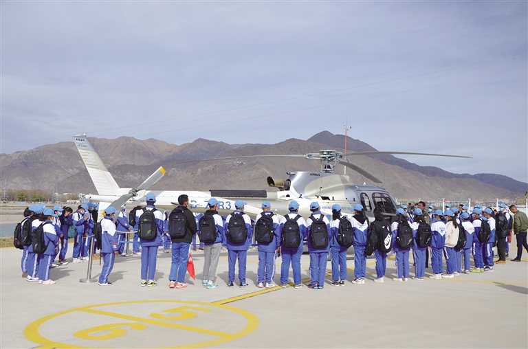 拉薩市中學(xué)生開展“游學(xué)幸福新拉薩 共筑美麗中國夢”主題研學(xué)實(shí)踐教育活動,參觀高原直升機(jī)。
