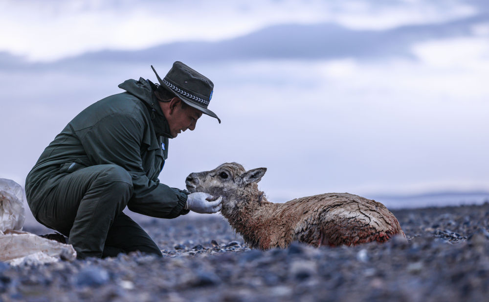 2024年6月14日,野生動(dòng)物專業(yè)管護(hù)隊(duì)員在西藏羌塘國(guó)家級(jí)自然保護(hù)區(qū)核心區(qū)安撫受傷的母藏羚羊。