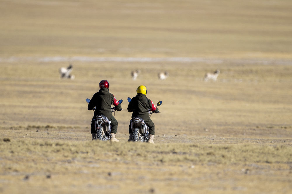 2023年12月17日,在西藏羌塘國(guó)家級(jí)自然保護(hù)區(qū),野生動(dòng)物管護(hù)隊(duì)員騎著摩托車觀察藏羚羊。