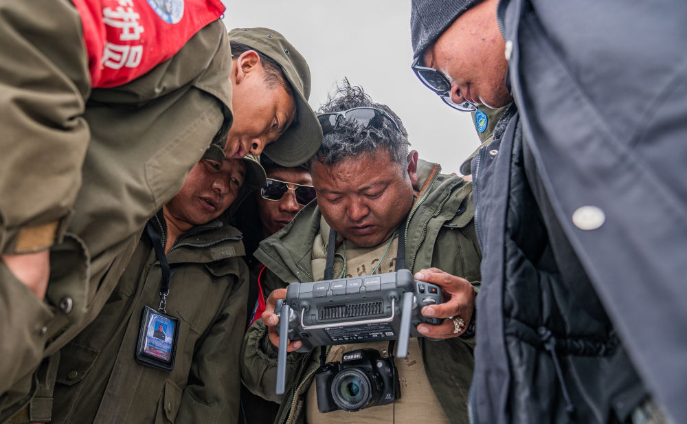 2024年5月10日,在西藏羌塘國(guó)家級(jí)自然保護(hù)區(qū),羅布玉杰管護(hù)站站長(zhǎng)格桑倫珠(右二)和隊(duì)員們?cè)诖笱┲胁僮鳠o(wú)人機(jī)觀察藏羚羊遷徙情況。